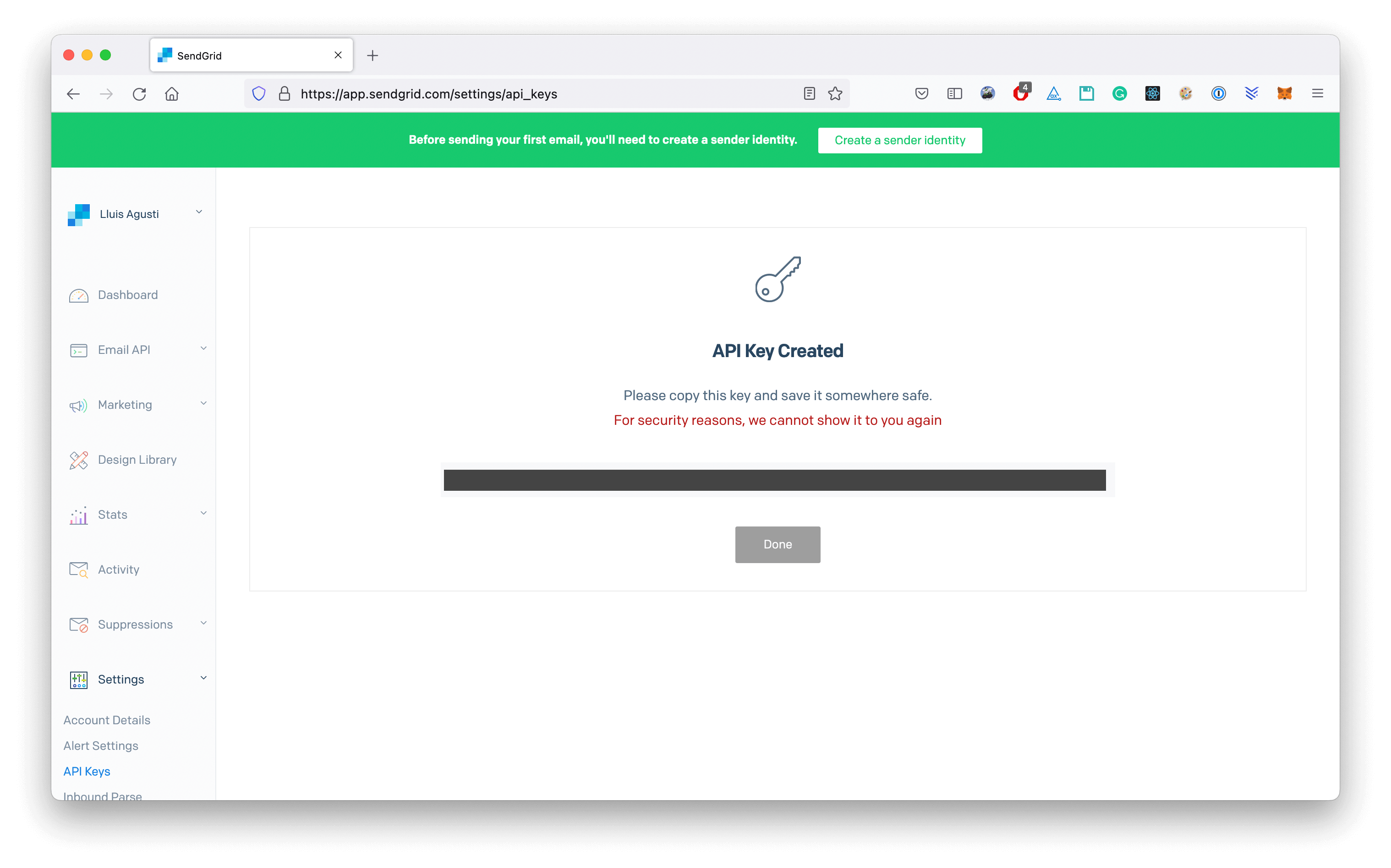 Note that we're also specifying from which domain email are going to be sent from. You're gonna need to verify a sender identity so that Sendgrid can send emails from your domain.